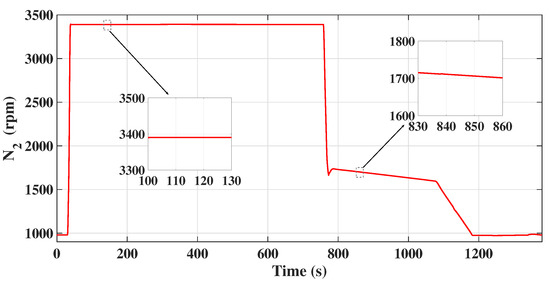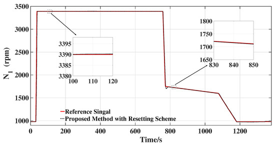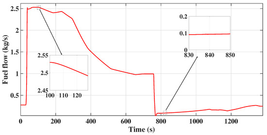 The simulation results for and the high-pressure rotor speed are shown in Figure 14, Figure 15 and Figure 16. It is evident that the proposed control method can enforce to track the reference signal accurately, without the steady error along with the full operating envelope. Furthermore, the fuel flow is shown in Figure 17, and the control input continuities during the controller transition process can be guaranteed by the resetting scheme.