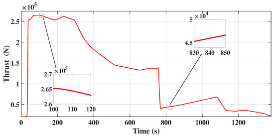Turbofan engine fan speed can be regulated by the designed controller to indirectly achieve the thrust control within the full flight envelope. The thrust produced by the engine is shown in Figure 18.