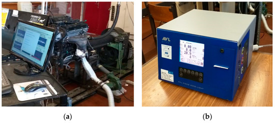 (a) Spark-ignition injection engine test on the dynamometer, and (b) emissions analyzer.