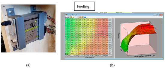 To enable the different fuels to be tested in the engine, it was necessary to use a programmable engine control unit (ECU Master EMU), enabling the fine-tuning of spark advance and fuel injection. During the test, two map tables were used to control volumetric efficiency and ignition advance. The volumetric efficiency map table is a function of the air throttle valve opening and closing to regulate the flow of air entering the cylinder in order to obtain a stoichiometric mixture of AFR or lambda 1, while the ignition advance map table shows the angle position of the crankshaft to the piston position at the top dead centre (TDC) during ignition [23,24]. The ECU is shown in Figure 2a, and one map for volumetric efficiency (fueling) is shown in Figure 2b. In the volumetric efficiency map table, there are three-dimensional maps consisting of air throttle position (%), constant crankshaft rotation speed (rpm), and constant load (acceleration pedal position or %).