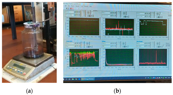 The mass of fuel was continuously measured with an electronic weighing scale (Figure 3a). The fuel consumption was measured with a Kern FCB 12K0.1B precision weighing device with a ±0.1 g maximum error attached to a data-acquisition system. The fuel flowrate was estimated by obtaining the slope of the line fitted to the mass variation along the test duration through a linear regression, which is an effective way of reducing random error. The various parameters were acquired with a National Instruments CompactDAQ system and analysed through the LabVIEW software program and control board (Figure 3b).
