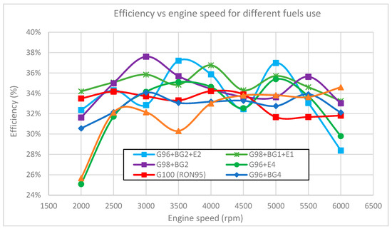 Engine brake efficiency is shown in Figure 5 for the different fuel blends at WOT and with stoichiometric mixtures. The maximum efficiency occurred at engine speeds between 3000 and 4000 rpm, although some mixtures had a local maximum at higher engine speeds. A higher overall efficiency was obtained for the mixtures of gasoline with biogasoline and ethanol in smaller proportions, namely the G96 + BG2 + E2, G98 + BG1 + E1, and G98 + BG2 mixtures, while the high-octane RON98 pump gasoline (GS100) and G96 + BG4 showed lower efficiencies compared to the others. Straight pump RON95 gasoline (G100) displayed medium/low values for the various fuel blends. The average percent variations of efficiency using a mixture of ethanol and biogasoline as an additive compared to commercial gasoline RON95 (G100) were as follows: GS100 = −2.8%; G96 + E4 = −1.8%; G98 + BG2 = 4.2%; G96 + BG4 = −0.9%; G98 + BG1 + E1 = 5.7%; and G96 + BG2 + E2 = 1.9%.