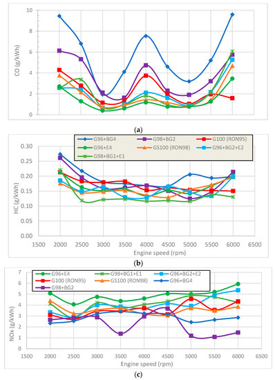 The formation of nitrogen oxides (Figure 6c) was mainly influenced by the high temperatures of the combustion, due to the Zeldovich reaction [13]. The addition of ethanol to the fuel (G96 + E4, BG98 + BG1 + E1, G96 + BG2 + E2) increased NOx production, most likely because the combustion was slower (ethanol burns faster than gasoline) and the spark advance was increased (because of its higher octane number), leading to higher combustion pressures and temperatures. Mixtures with biogasoline (G98 + BG2, G96 + BG4) produced lower NOx, most likely because the combustion characteristics (lower combustion speed) of the biogasoline deteriorated the combustion of the pump gasoline, although G96 + BG4 was tested with a longer ignition advance. Figure 6 shows the results for NOx. In the case of G98 + BG2, there were substantial NOx oscillations depending on the engine speed. We are not sure why this happened, but since NOx is so dependent on mixture strength, we believe that these oscillations may have been related to that effect. In [21], the authors observed that NOx was mainly a function of lambda, not the ethanol percentage in the mixture.