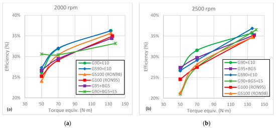 Figure 7a,b show the resulting efficiencies for the two pump fuels (RON98 and RON95) and for the various blends, for two prescribed torque conditions (50 and 70 Nm) and for the two engine speeds (2000 and 2500 rpm). In addition, the same graphs show the values for the WOT conditions. In all cases, the fuels with ethanol (G90 + E10, GS90 + E10) yielded better efficiencies than the base fuels (RON98 and RON95). The addition of biofuel (G95 + BG5) to the RON95 also improved the efficiency in all the cases, but with lower improvements than for ethanol. The tests with addition of ethanol and biogasoline (G90 + BG5 + E5) were not conclusive. However, it was noticeable that the WOT tests of the mixture with ethanol and biogasoline produced more torque than any other mixture. Again, the tests using ethanol added to the pump gasoline showed higher efficiency than those for the base gasoline.