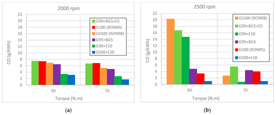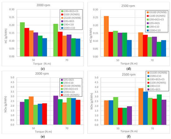 In terms of NOx, Figure 8e,f show that the trend was not evident, as with previous emission results. Although the tests for WOT showed that the addition of ethanol (G90E10, GS90E10) yielded higher values for NOx, and the base RON95 gasoline had the lowest NOx emissions, which were expected, the results for the partial load (50 and 70 Nm torque) did not follow this trend. RON98 gasoloine seemed to produce more NOx than RON95, and the addition of biogasoline (G95 + BG5) had a small detrimental effect on those emissions. The addition of ethanol showed an increase in NOx when added to RON95 gasoline (from RON95 to G95 + E10), but that effect was not evident for RON98 (from RON98 to GS90 + E10).