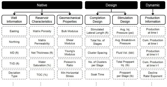 Productivity among different wells can differ based on geological properties or hydraulic fracturing designs [44], and limitations exist in the acquisition of reservoir properties and geological information among native, design, and dynamic parameters. Therefore, the features should be selected and extracted from data preprocessing from limited data, and related variables should be identified to derive key factors in shale formations.