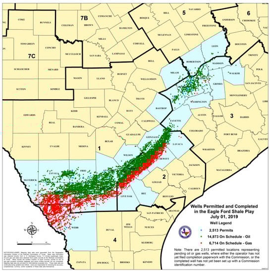 - Texas RRC. Eagle Ford Shale Information. Available online: www.rrc.texas.gov/oil-and-gas/major-oil-and-gas-formations/eagle-ford-shale/ (accessed on 10 August 2021).