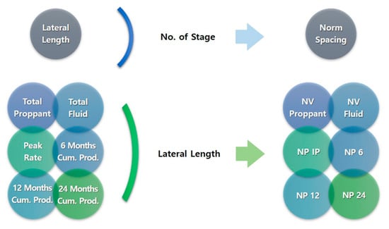 The field data were normalized with the lateral length or number of stages to allow comparisons among multiple wells (Figure 4). The normalized volume (NV) and normalized production (NP) were derived, and the value per unit length was calculated assuming that the number of stages was equally distributed [42]. In addition, preprocessing was performed on production-related attributes, such as removing very small or large outliers for each attribute.
