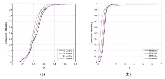 Change of cumulative probability for the DCA parameters according to production period: (a) the initial decline rate; (b) the decline exponent analysis for permeability.