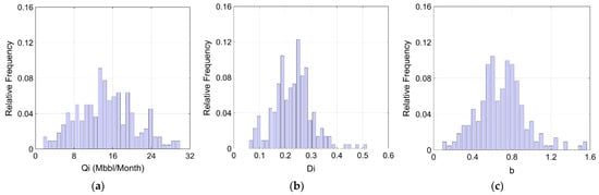 Relative frequency of the DCA parameters after preprocessing: (a) the initial production rate; (b) the initial decline rate; and (c) the decline exponent.