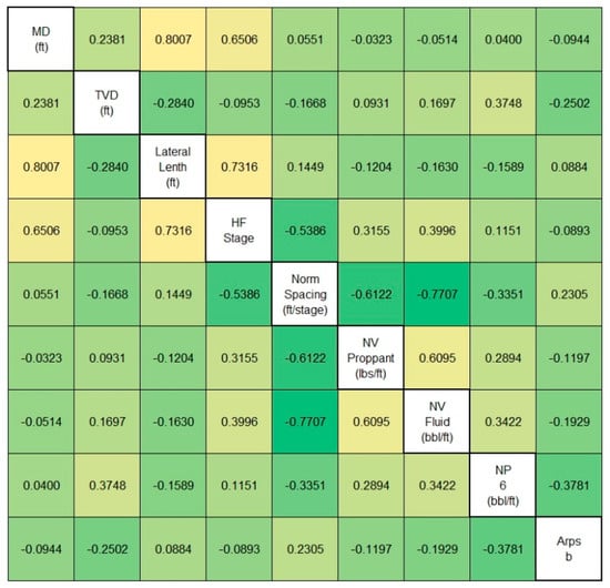 The lateral length and measure depth (MD) showed a correlation of 0.8, and the hydraulic fracturing (HF) stage, lateral length, norm spacing, and NV fluid (NVF) showed a correlation exceeding 0.7. In addition, the MD and HF stages, NV proppant (NVP), norm spacing, and NVF and NVP showed values over 0.6. Finally, the HF stage and norm spacing exhibited correlations of >0.5. However, the other factors were found to have nonlinear relationships.