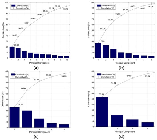 Scree plot of PCA results for all cases: (a) Case 1; (b) Case 2; (c) Case 3; (d) Case 4.