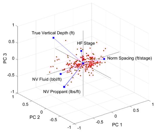 Apart from the lateral length used for normalization, based on the analysis of the primary attributes affecting the PCs, a PCA was performed in Case 4 to determine the effects of the true vertical depth (TVD) and hydraulic fracturing design factors. As shown in Figure 9d, it was found that the three PCs represented a large portion (approximately 88%) when using only five limited attributes. In addition, Table 4 shows the values of the key factors for each PC, and based on these values, factors with absolute values of 0.4 or higher were determined to be correlated with the PC. Moreover, the influence of the key factors on each PC was quantitatively different and classified without overlapping. These results are shown in Figure 10, and a significant correlation between the positive and negative directions was observed. The norm spacing, NVF, and NVP for PC 1, TVD and HF stages for PC 2, and the number of HF stages and NVP for PC 3 are represented as follows: