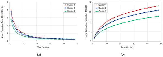 These results indirectly confirmed the initial decline in the production at 6 and 12 months. The production behavior before the latter half period, which continues with low production, can be identified from the cumulative production of 48 months. By deriving these probabilistic results, uncertainty about the deterministic results was considered, and the cumulative production per unit length can be predicted using the cumulative production at a specific time, hydraulic fracturing design factors, and decline curve factors for each group.