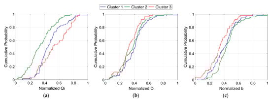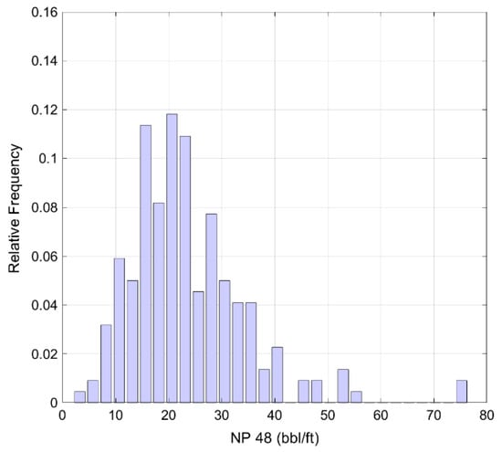 Normalization was performed to obtain NV and NP for comparison of multiple wells, and preprocessing was performed on production-related attributes in the study area. To obtain the dynamic attributes, previous studies used more than 12 months to estimate the decline curve parameters [16,19], but stable production behavior was observed when long-term production data were used [33]. In this study, 48 months of production history data from 220 production wells were used to obtain the dynamic attributes. Different results of the decline exponent were estimated according to the period of production rate data used for DCA [35]. Therefore, DCA was performed according to the production period, and the cumulative probability distribution of the initial decline rate and decline exponent was derived for the total production wells (Figure 5). The production rate data for a sufficient period of 48 months were used; however, despite the shale formations, a value exceeding 1 rarely appeared, (Figure 6). If the decline exponent exceeds 1, it is called ‘beyond hyperbolic’, which is in the same form as that of the hyperbolic function in a shale reservoir [37].