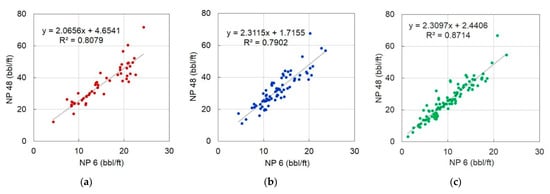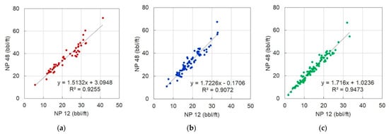 Comparison of the measured and predicted production for the testing wells: (a) NP 6; (b) NP 12; (c) NP 24.