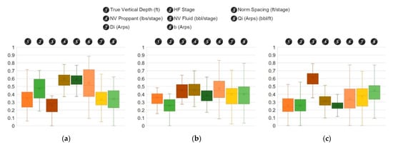 Among the 22 attributes, if the correlation between the production volume and well location exceeded 0.9, it was considered a duplicate state. Duplicate values were eliminated from the 22 attributes, and 16 attributes were analyzed for Case 1, considering the surface latitude, surface longitude, and NP 6. For Case 1, it was found that three principal components (PCs) represented approximately 51% of the total attributes, and the PC coefficients of county number, well elevation, landing direction, and choke size were smaller than those of the other attributes (Figure 9a). In Case 2, 12 attributes were analyzed, except for the four attributes in Case 1, which had a low correlation with the PCs. Three PCs represented approximately 76% of the total attributes (Figure 9b). In Case 3, two decline curve parameters with relatively small PC coefficients and well locations with similar ranges of coefficient values for all PCs were excluded. The results revealed that the three PCs represented approximately 82% of the eight attributes, and the effects on the main attributes were considered for Cases 1 and 2 (Figure 9c).