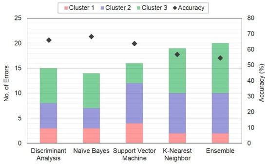 The naïve Bayes classifier is a classification algorithm based on the concept of probabilities and statistics and is widely used in research [53]. This analysis is performed under the assumption that different features in clusters are statistically independent, based on conditional probability. Clusters are classified based on the highest probability that new data will belong to a specific cluster, and because it can be classified into training data, it has the advantage of high computational efficiency.