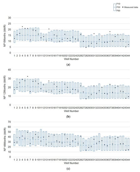 Prediction of the probabilistic production for new wells according to the production period: (a) NP 6; (b) NP 12; (c) NP 24.