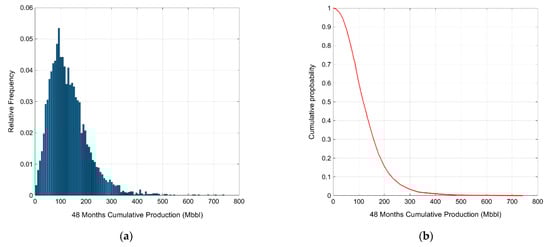 Probabilistic results of the total wells using the Arps hyperbolic for 48 months: (a) Histogram; (b) the cumulative probability distribution.