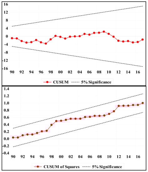 All aspects of economic and non-economic activities in the globalized world economy are heavily reliant on energy inputs in one way or another, and thus, energy security and sustainability are its responsibilities, as is a major portion of greenhouse gas emissions (GHG). In contrast, the total usage of natural gas for electricity, driven mostly by oil and renewables, has increased the extreme energy demand. Depending on the market, energy demand and availability continue to grow. With regard to the above-mentioned evidence, the significant rise in the demand for energy would eventually contribute to a significant increase in greenhouse gas emissions. If stricter environmental policies are not implemented, greenhouse gas emissions will more than triple in the coming decades [,]. Emerging countries are also concerned with sustainable development models and the intentions of emerging economies with the rise in emissions of carbon. Nature-rich countries can reduce environmental pollution by curbing use of fossil fuels and reducing imports. On the other side, the use of natural resources can be slowed down by implementing environmental management methods and by continual improvement in the development and use of excess natural energy; as some resources can now be regenerated and replaced. One of the major sources of environmental destruction is human actions, including deforestation, logging, and cultivation [,,]. The plots of CUSUM and its squares are illustrated in Figure 2 with a 5% significance level.
