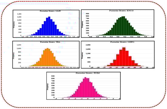 The consequences show that globalization and energy usage have positive linkages to the ecological footprint in Pakistan with coefficients of (0.229) and (0.122). The posterior, lower, and upper values at 95% are (0.314), (0.231), (−0.397), (−0.337), (0.849), and (0.575). Similarly, the variables trade, GDP growth, and fuel importation have a negative relation to ecological footprint with coefficients of (−0.468), (−0.089), and (−0.023), and have posterior, lower, and upper values at 95% (0.179), (0.053), (0.108), (−0.831), (−0.194), (−0.234), (−0.111), (0.015), and (0.195), reliably. Figure 3 depicts the plots of the posterior draws via linear Gaussian estimates.