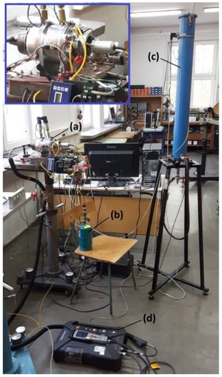 The subject of the research was the GTM-120 gas turbine. It is a single-shaft unit with a single-stage radial compressor, a single-stage turbine and a quasi-reverse flow combustion chamber [31,32]. The gas turbine (TG) with the test stand is shown in Figure 1. In Figure 1, the TG with the connected sensors is marked with Figure 1a, and its close-up is also shown in the frame. The TG is equipped with a thermocouple enabling temperature measurement in the flow between the outlet from the combustion chamber and the grid of the turbine guide vanes. A K-type thermocouple (NiCr-NiAl) was used, and its measurement accuracy was ±0.4% of the measured temperature value. The TG was placed on a bearing platform that allowed for movement along the axis of the tested unit, which made it possible to measure the thrust using a strain gauge beam with a total measurement uncertainty of ±0.55 N. Modified for the needs of the experiment, the factory TG housing also allows for measurements of the temperature, total and dynamic pressure in the inlet section, temperature and pressure downstream of the compressor diffuser, pressure in the plane of the outlet from the combustion chamber, and temperature in the outlet section of the turbine nozzle. The gas fuel tank is marked with Figure 1b. In the initial stage of start-up, TG GTM-120 is fed with gaseous fuel due to its easier ignition than liquid fuels. Combustion of gaseous fuel during the start-up is stopped at the moment when the temperature in the combustion chamber of the gas turbine is reached that allows the liquid fuel to evaporate. After these conditions are achieved, the TG is supplied only with liquid fuel from the tank marked in Figure 1c. The liquid fuel tank is equipped with a differential pressure sensor that measures the difference between the ambient pressure and the pressure of the liquid column. The change in voltage on the pressure transducer caused by the change in the pressure of the liquid column during the test was recorded in real time. The sensors used to measure the thrust and fuel consumption allow for the calculation of thrust-specific fuel consumptions (TSFC) with the complex standard uncertainty of ±0.045 kg/(N × h) (80k rpm) calculated by the total differential method. All the above-mentioned parameters were recorded at a frequency of 40 Hz. The in Figure 1d indicates the Testo 350 exhaust gas analyzer, the probe of which is located in the plane of the outlet from the TG nozzle. Details of the sensors with which the exhaust gas analyzer was equipped are included in Table 1. The presented resolutions and accuracy of measurements correspond to the emission range in which the experimental tests were conducted. Data acquisition from the exhaust gas analyzer was carried out in real time with a frequency of 1 Hz.