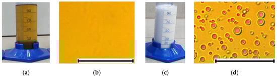 Fuel mixture ingredients; (a) emulsifier, (b) microscopic photo S2; (c) fuel-water emulsion; (d) microscopic photograph of a fuel-water emulsion. Scale bar corresponds to 50 µm.