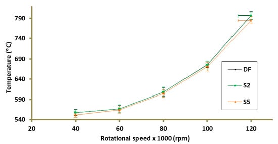 Figure 3 shows the results of the temperature measurement downstream of the combustion chamber (T4) for the cases of supplying TG, DF, and fuels with the addition of surfactant, in two variants. The maximum difference in average recorded temperatures between the DF case and the modified fuels was 1.4 °C (100k rpm) and 11.9 °C (120k rpm) for S2 and S3, successively. At the measuring point corresponding to 80k rpm, which is the nominal TG operating point [34], the temperature difference between the case in which TG was supplied to DF and S2 did not exceed 1 °C. On the other hand, the use of a fuel mixture containing 5% of the emulsifier caused a temperature drop by 4 °C in relation to the DF at the same measuring point (Figure 6a).