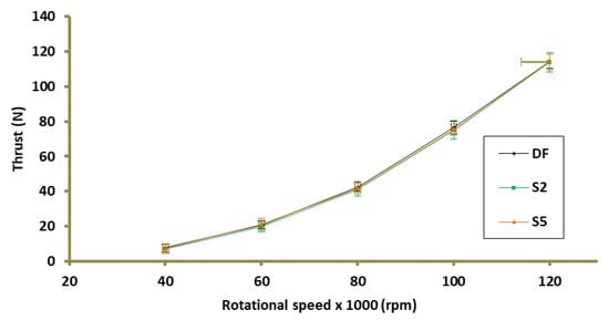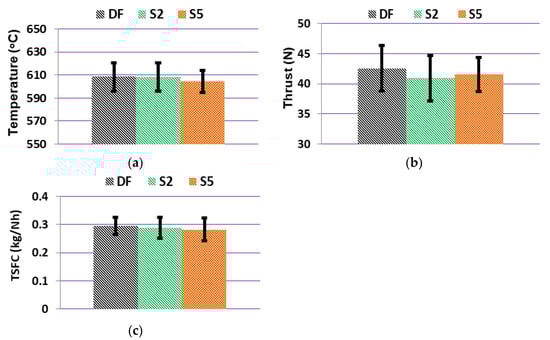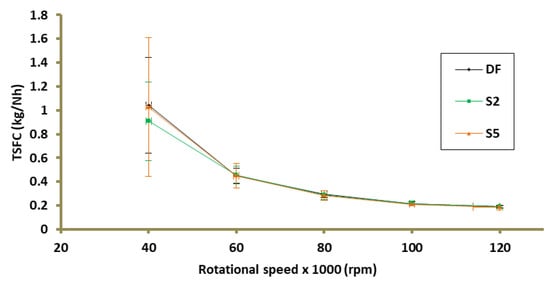 Figure 5 shows thrust-specific fuel consumptions (TSFC) depending on the rotational speed of the gas turbine. TSFC is defined as the amount of DF required to generate one Newton in one hour. The maximum difference with respect to the DF that was noted in the TSFC did not exceed 0.014 kg/(N × h). For the regime corresponding to the design TG work point (80k rpm), a change in TSCF by 2.5% and 4.6% was recorded for S2 and S5, successively in relation to DF (Figure 6c). As the load on the gas turbine decreased, the standard deviation of TSCF increased. This is due to the limitations of the TG controller, which is able to maintain the set turbine revolutions with a certain accuracy that does not change with the change of the load of the controlled unit. Consequently, the standard deviations of the thrust, in absolute values, for the entire measuring range do not change significantly, while their relative values are the greater the smaller the thrust generated by the TG. A similar relationship between the measurement uncertainty of TSFC and the engine load was reported in [35].