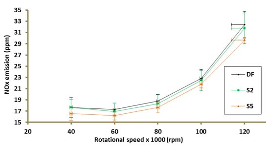 Figure 7 shows NOx (NO + NO2) emissions as a function of TG rotations for DF, S2, and S5 fuel mixtures. The maximum difference in NOx emissions between DF and S2 was 0.4 ppm, it was recorded at 60k rpm. On the other hand, the use of S5 fuel resulted in a reduction of NOx emissions by 1.9 ppm at the measuring point of 120k rpm. At the design point of operation TG (80k rpm), the use of fuel additives resulted in a decrease in NOx emissions by 1.6% and 5.1% for cases S2, S5, successively (Figure 11a).