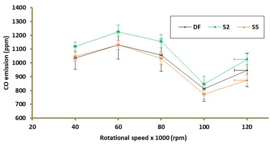 For the case of using S2 as a fuel, an increase in CO emissions was recorded at all analyzed measuring points (Figure 8). The maximum increase in CO emission for the case of S2 against DF was 9.1% (80k rpm). In the case of supplying TG with a fuel mixture with 5% addition of an emulsifier, changes in CO emission were noted in relation to the base case (DF), not exceeding 7.6% (120k rpm). At the design point of operation TG (80k rpm), the changes in CO emission in relation to DF were, for S2 and S5, 9.1% (increase) and 2.3% (decrease), respectively (Figure 11b).
