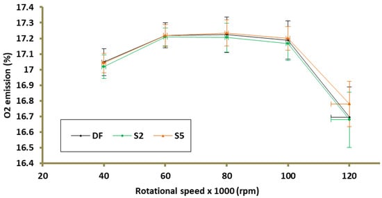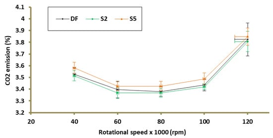 CO2 emission as a function of rotational speed is presented in Figure 9. The greatest change in emission in relation to the base case (DF) was caused using S5 fuel, an increase by 1.5% (100k rpm). The use of the S2 fuel mixture at any of the measuring points did not change the CO2 emission by more than 1% compared to the case in which TG was powered by DF. At the TG operating point corresponding to 80k rpm, the CO2 emissions are: 3.38%, 3.37%, and 3.43% for DF, S2, and S5, respectively (Figure 11c). The modification of the fuel mixture did not cause any significant changes in O2 emission (Figure 10). At the TG design operating point, the percentage change in O2 emission with respect to DF for the 2S and 5S turbine supply cases was 0.11% (decrease) and 0.06% (increase), respectively (Figure 11d).