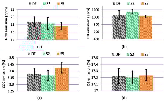 - Increasing the amount of emulsifier in the fuel from 2% to 5% eliminates the negative impact of the addition of emulsifier on CO emissions, which was noted in the case of S2. In addition, it reduces NOx emissions—a decrease of 8.5% compared to the case in which DF was burned.
