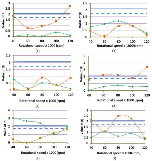 The values of the t parameter obtained as a result of the statistical analysis are presented in Figure 12. The blue horizontal lines mark the critical values of the t parameter at the significance level p = 0.05 [36], for the two-sided alternative hypothesis—by a solid line, and for one-sided alternative hypotheses—by a dashed line. Exceeding the critical value of the parameter t at a given measuring point implies the rejection of the null hypothesis about the equality of means and the adoption of an alternative hypothesis.