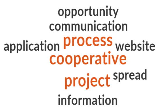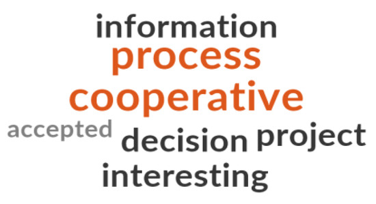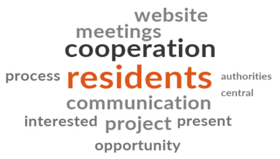 Semantic analysis of the words included in the interviews allowed us to create a cloud of the most frequently used phrases that built the Dialogue category (Figure 1). These refer, first of all, to the most important actors involved in it, while at the same time have the status of keywords (residents, cooperative). There are also word categories present that are related to the procedural character of dialogue, such as ‘communication’, ‘conversation’, ‘meetings’, ‘online’, ‘information’, ‘direct’, or to characteristics related mainly to the environment in which it is realized, ‘project’, ‘application’, or values related to it, ‘trust’, ‘cooperation’, ‘interest’.