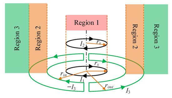 It is apparent from Figure 1 that each half-loop is equivalent to half of a circle, with its inner radius denoted by rin and outer radius denoted by rout. Two half-loops are installed around the transmitting coil, and the radius of the transmitting coil is rs; thus, it is obvious that rin > rs. To facilitate the discussion at a later stage, the regions in Figure 1 are divided as follows: inside the transmitting coil, i.e., r < rs, is noted as region 1; excluding the transmitting coil part, the region inside the active shielding coil, i.e., rin < r < rout, is denoted as region 2; outside the active shielding coil, i.e., r > rout, is noted as region 3.
