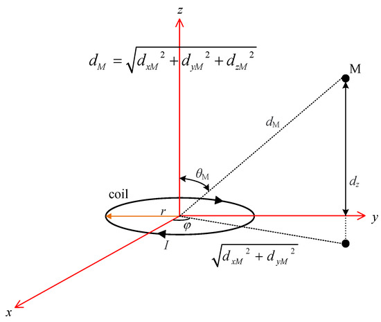 In Figure 2, the geometric model of the distance from the center of coil to point M is demonstrated, where the magnetic flux density at point M is a function of the coil radius, the current flowing through the coil, and the distance from the coil center to point M. The total magnetic flux density at point M is calculated by the following Equation (1) [29]: