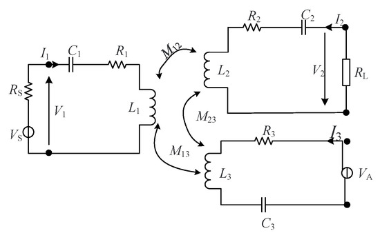The theory of double-coil active coil shielding is here addressed using a circuit approach. A WPT system with a series–series (SS) compensation topology [33] is modeled using an equivalent circuit as shown in Figure 4, with R1, R2, and R3 as the internal resistances; L1, L2, and L3 as self-inductances; C1, C2, and C3 as capacitances, and RL and RS as the resistive load and internal resistance of power transmitting. M12, M13, and M23 are the mutual inductances between coils, and subscript ‘1’, ‘2’, ‘3’ indicates the transmitting, receiving, and shielding coil, respectively. VS and VA are the power supply of the transmitting coil and the shielding coil, and I1, I2, and I3 are the current of the transmitting, receiving, and shielding coil, respectively. ω is the angular operating frequency.