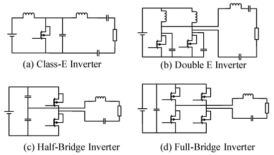 The topologies often used in high-frequency inverter circuits are class E [34], double E [35], half-bridge, and full-bridge [36], and their circuit structures are shown in Figure 6.