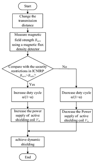 To further implement the dynamic shielding scheme, an MCU is added to the WPT system to guide the adjustment of α according to the detected magnetic flux density, and finally to enable the dynamic adjustment of VA. The algorithm flowchart of the proposed dynamic shielding scheme is presented in Figure 7.
