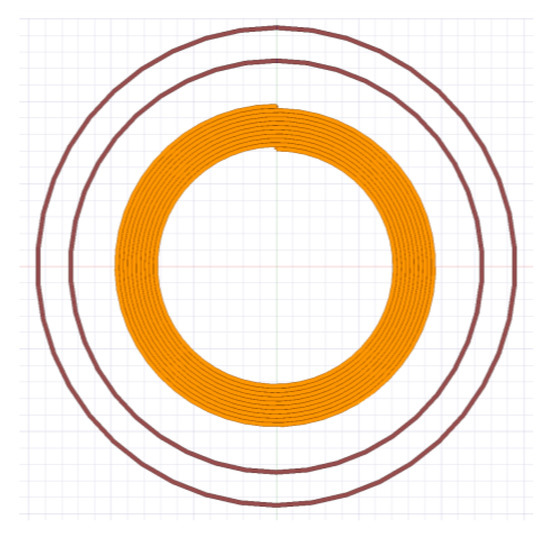 For the verification of the proposed dynamic shielding scheme based on double-coil active shielding, a WPT system is built using ANSYS Maxwell simulation software. The WPT system operates at 85 kHz, and the safety limit of ICNIRP at this operating frequency is 27 μT. The simulated structure of the WPT coils is depicted in Figure 8. The transmitting and receiving coils have the same structure, both of which have an external radius of 100 mm; the number of turns N is 10, and the transmission distance Z2 is initialized to 100 mm. The double-coil active shielding structure consists of two half-loops with outer radius rout = 150 cm and inner radius rin = 130 cm.