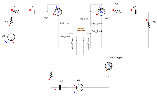 The circuit for the combined simulation by 3D Maxwell and Simplorer is illustrated in Figure 9. The transmitting power supply VS of the WPT system is set to 30 V. The internal resistance of power supply RS is 8 mΩ, and the resistance of the load resistor RL = 10 Ω. The other simulation parameters of the circuit are listed in Table 2. In addition, the variation of the power supply of the active shielding coil VA with the variation of the distance between the transmitting coil and receiving coil is given in the subsequent discussion. In addition, the changes in the power supply of active shielding coil VA with transmission distance are given in the subsequent discussion.