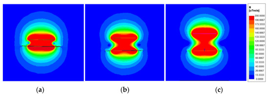 The magnetic flux density distribution of WPT system with no shielding: (a) 50 mm; (b) 100 mm; (c) 150 mm.