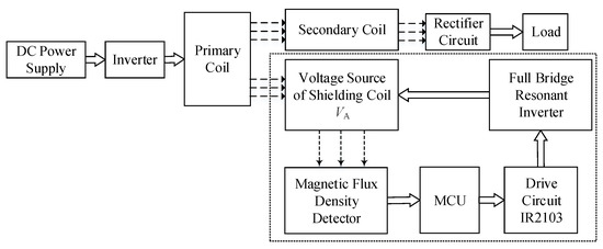 A DC-AC inverter circuit with an adjustable duty cycle is added to the control loop so as to control the power supply of the active shielding coil. By adjusting VA, high SE for EMF leakage at varying distances is achieved in the active shielding system. The circuit design is shown in Figure 5.