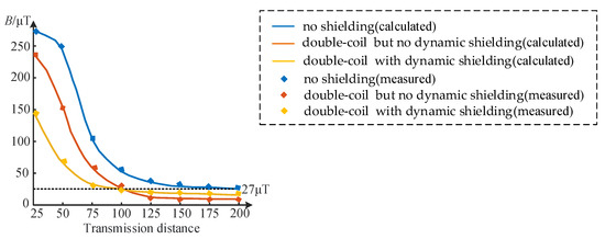 When the transmission distance is shortened, the magnetic flux density increases accordingly. Therefore, to meet the shielding requirements, the proposed dynamic shielding scheme is used to increase the VA to 41.61 V and to shield from excessive EMF leakage. When the distance increases, the magnetic flux density becomes smaller correspondingly. At this point, based on the consideration of saving resources and economic costs, VA is reduced to 20.06 V consequently, so that the EMF leakage is exactly within the safety limit of the ICNIRP standard, avoiding the unnecessary waste of resources.