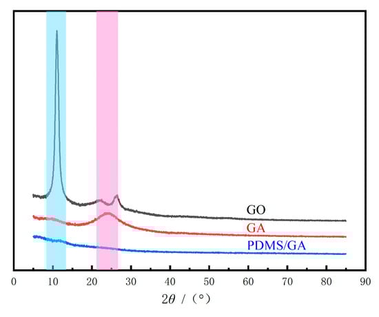 Figure 3 reports X-ray diffraction (XRD) patterns of GO, GA and PDMS/GA. There was a very sharp diffraction peak at 2θ = 10.990° and the interlayer spacing was 8.0441. This is due to the presence of oxygen-containing functional groups such as hydroxyl carboxyl groups on the GO surface, which leads to the presence of intercalated water molecules. The improved interlayer spacing and the graphene oxide synthesized in other literature [32] was basically the same. From the XRD pattern of GA, it can be seen that a wider diffraction peak was observed at 2θ = 24.014°, the corresponding interlayer spacing was d = 0.37027 nm. The intensity of the diffraction peak was reduced, the diffraction peak became wider and the sharp diffraction peak disappeared. These changes indicate that the oxygen-containing functional group indicated by GO was removed by the hydrothermal reduction reaction, which reduced the interlayer spacing of GA and improved the hydrophobicity to a certain extent. From the XRD pattern of PDMS/GA, it can be seen that the modified PDMS/GA was in an amorphous state.