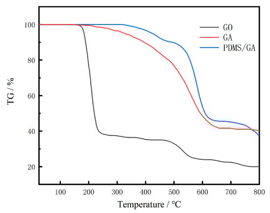 In Figure 4, since all samples were freeze-dried or vacuum-dried and then subjected to thermogravimetric treatment, there was no significant quality degradation at 25–120 °C. The first significant thermal weight-loss stage of GO was 150–240 °C. The weight loss in this stage was mainly caused by the decomposition of oxygen-containing functional groups in GO; after 240 °C, the slow decrease in the mass of GO was also caused by the decomposition of oxygen-containing functional groups; After 475℃, its mass continued to decrease, which was due to the change in mass caused by the burning of amorphous carbon in the graphite powder during the test. GA and PDMS/GA continued to decrease slowly from 150 °C, which indicated that the unreduced oxygen-containing groups disappeared. At 475 °C, the amorphous carbon in the gel starts to burn, so there is a significant thermal weight loss stage. At 730 °C due to PDMS, the combustion of the silicone rubber formed after curing leads to changes in the quality development and a significant thermal weight loss stage.