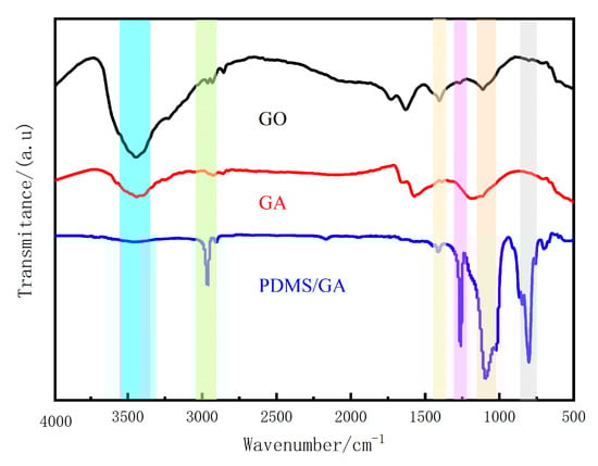 FTIR spectra of raw GO, GA, and PDMS/GA (the shadows from left to right are 3446 cm−1, 2963 cm−1, 1403 cm−1, 1262 cm−1, 1092 cm−1, and 801 cm−1).