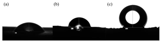 (a) Contact angle of GO; (b) Contact angle of GA; (c) Contact angle of PDMS/GA.
